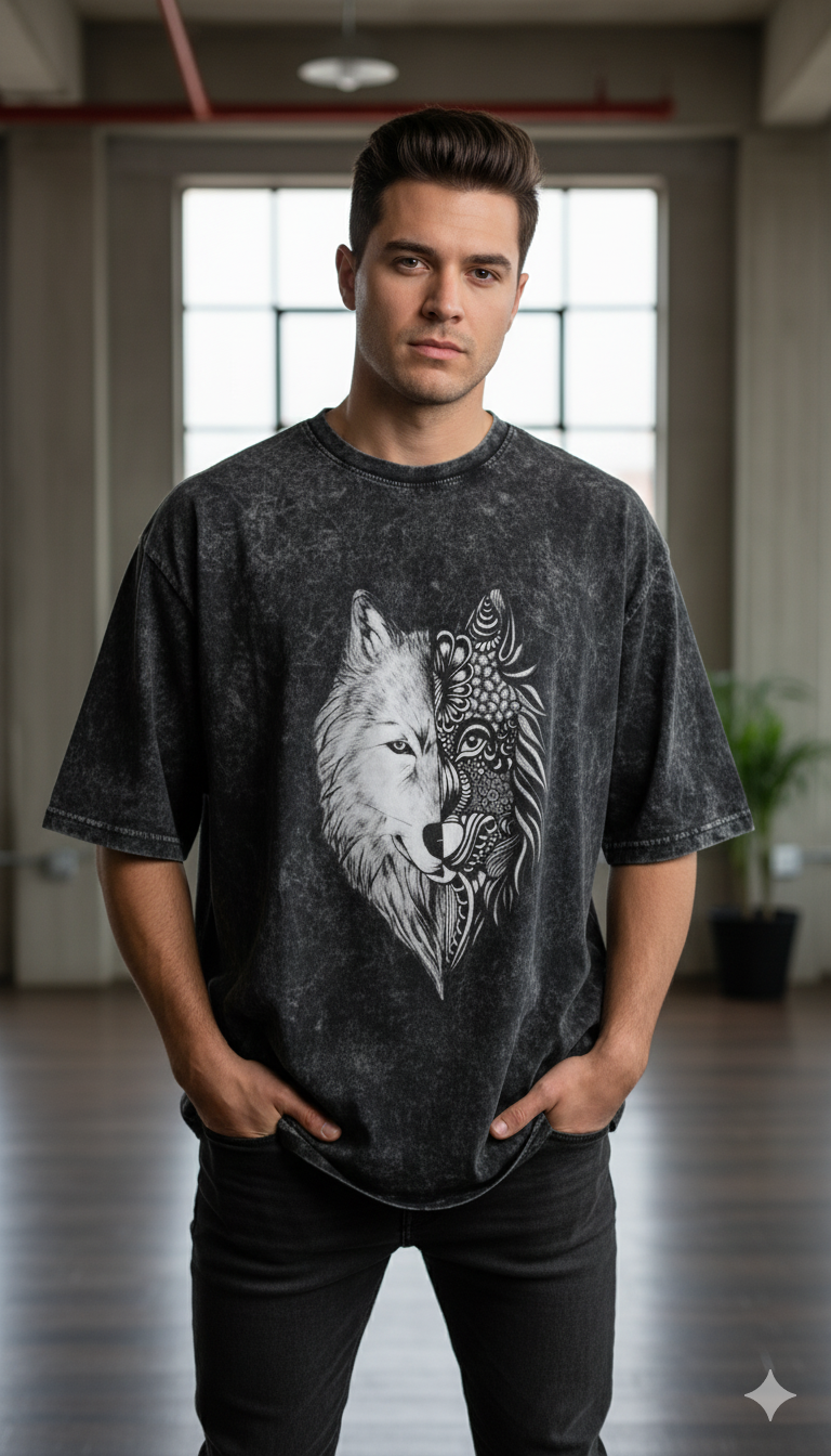 - Features a striking black and white wolf doodle artwork placed at the center.