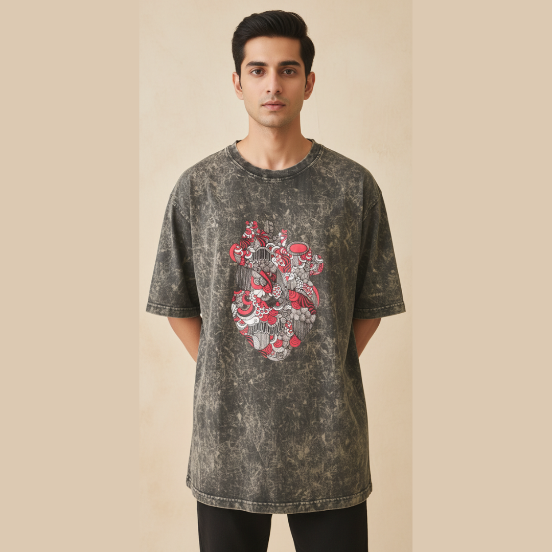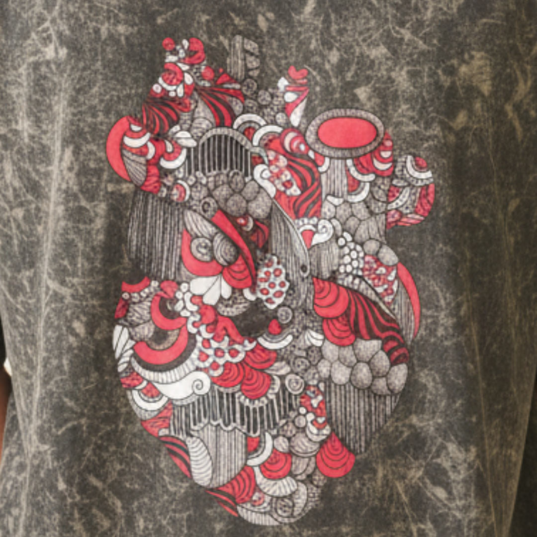 - Features a striking black and red human heart doodle artwork placed at the center.